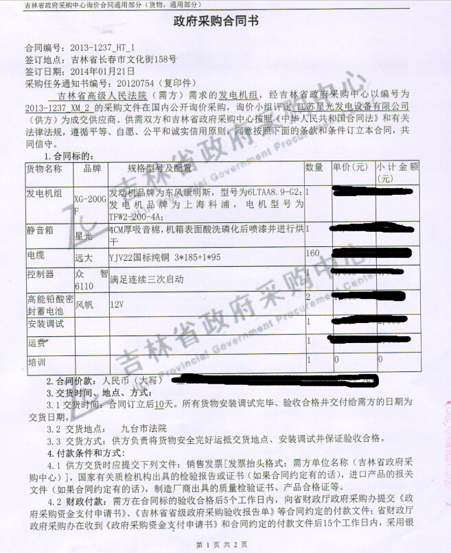 吉林省高级人民法院政府采购200KW发电机组: